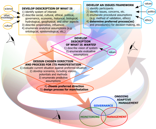 The diagram illustrates the necessity to integrate the biophysical sciences and the social sciences to generate an ecosystem description of the biophysical and socio-economic-political situation. This is used to formulate feasible and desirable futures, one of which is chosen to promote. It is then necessary to design a collaborative learning process for the ongoing adaptive process of governance, management, and monitoring for sustainability.